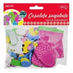 Pachetul contine forme de iepurasi, cosulete, oua,puisori si floricele realizate din spuma autoadeziva